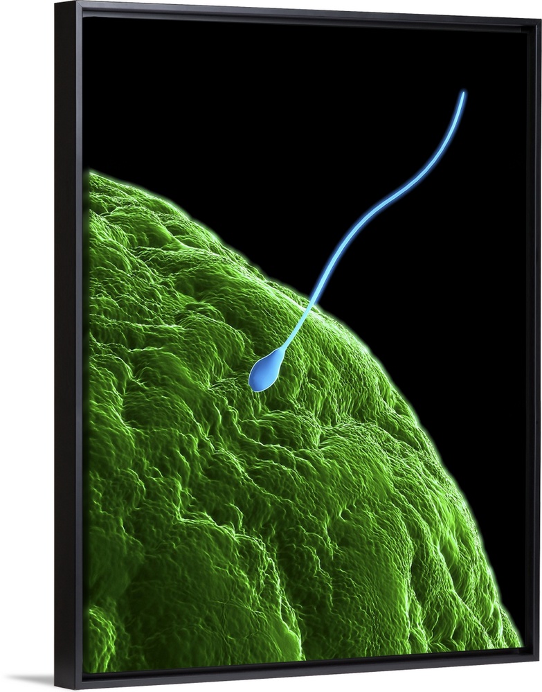 <p>Fertilisation. Computer artwork of a sperm cell (purple) penetrating a human egg (ovum). Each sperm (spermatozoan) has a rounded head (acrosome) and a long tail with which it swims. Women usually release one egg per month, whereas men release millions of sperm in each ejaculation. Only one of these sperm will penetrate the egg's thick outer layer (zona pellucida) and fertilise it. Fertilisation occurs when the sperm's genetic material (deoxyribonucleic acid, DNA) fuses with the egg's DNA. When this occurs the egg forms a barrier to other sperm.</p>
