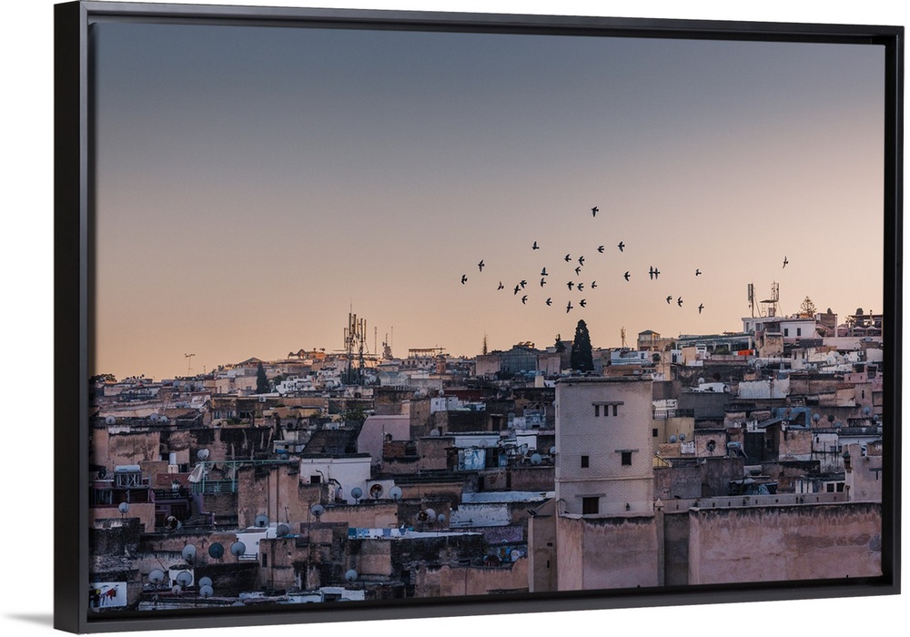 <p>Birds flying over the medina of Fes, Morocco, during sunset.</p>