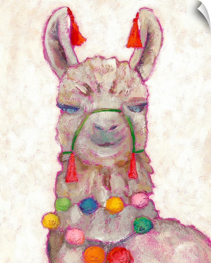 <p>Lovely illustration of a llama decorated with colorful pom poms and tassels.</p>