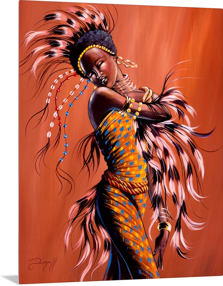 <p>Contemporary African painting of a woman in traditional festival dress dancing.</p>