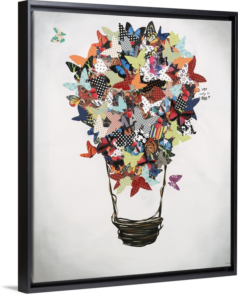 <p>Mixed media artwork with cut out butterflies in various colors and patterns creating the top of a light bulb on a white and gray vignetted background.</p>