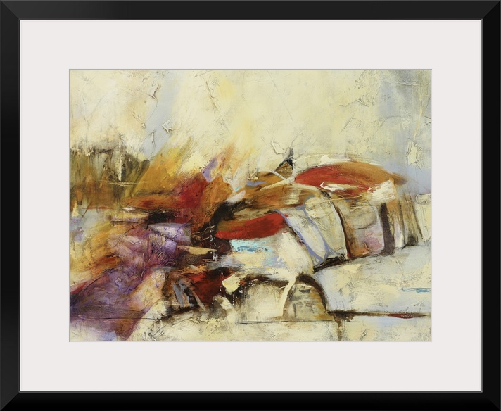 <p>Horizontal abstract painting in tones of yellow, orange and red with textured cream accents.</p>
