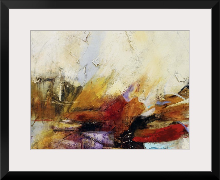 <p>Horizontal abstract painting in tones of yellow, orange and red with textured cream accents.</p>