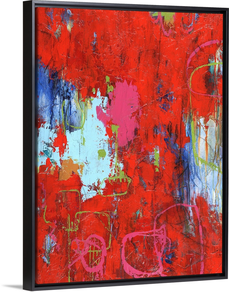<p>Large abstract painting with bright red hues with pink and green lines on top and shades of blue in the background.</p>