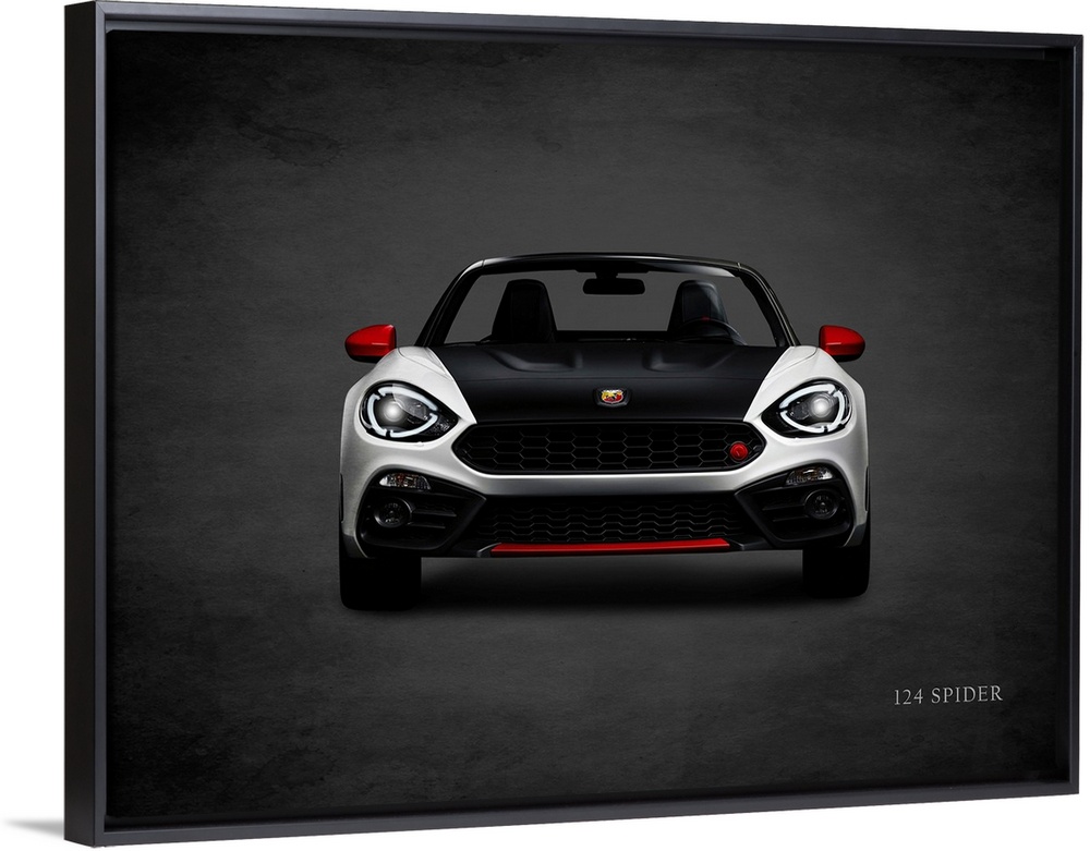 <p>Photograph of a silver, black, and red Fiat 124 Spider printed on a black background with a dark vignette.</p>