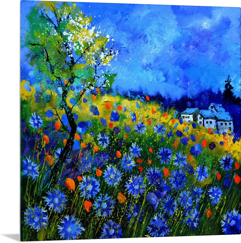 <p>Vibrant painting of a bright Summer day with blossoming flowers, a colorful sky, and a house in the distance.</p>