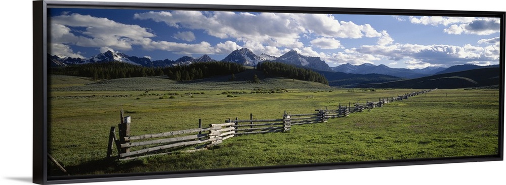 <p>Panoramic picture taken of a vast field with a small wooden fence going as far back as you can see. Mountains line the back of the picture with thick clouds floating in the sky.</p>