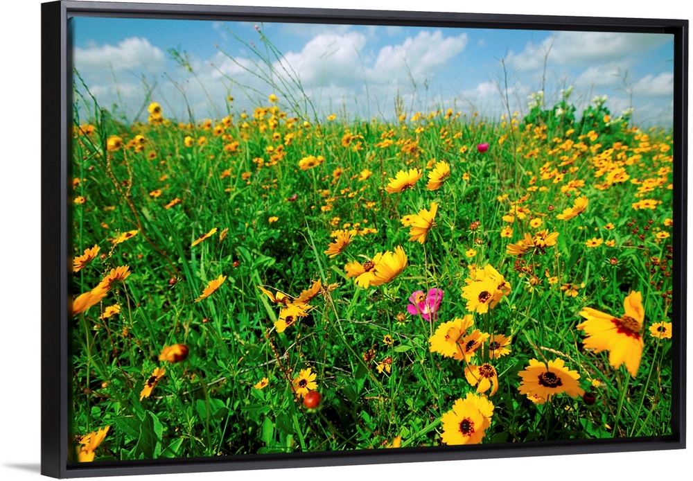 <p>Field of coreopsis wildflowers (Coreopsis tinctoria)in coastal prairie</p>