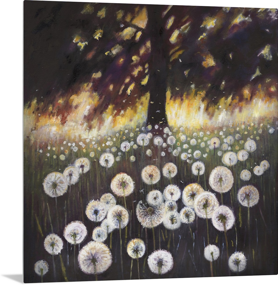 <p>A dark and dreamy landscape depicting mature dandelion seedheads in a field of grass beneath a large tree, in tones of dark green, browns and gold</p>