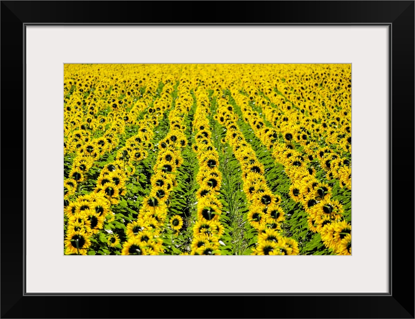 <p>Field of giant yellow sunflowers in full bloom, Oraison, Alpes-de-Haute-Provence, Provence-Alpes-Cote d'Azur, France.</p>
