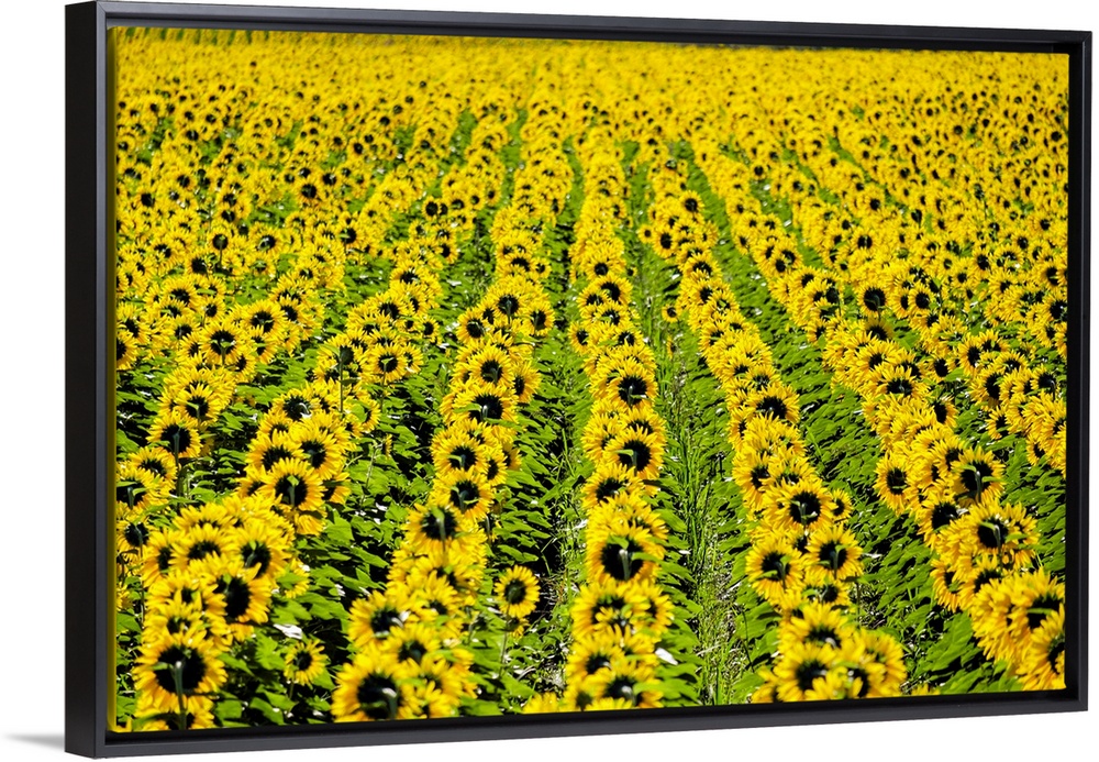 <p>Field of giant yellow sunflowers in full bloom, Oraison, Alpes-de-Haute-Provence, Provence-Alpes-Cote d'Azur, France.</p>