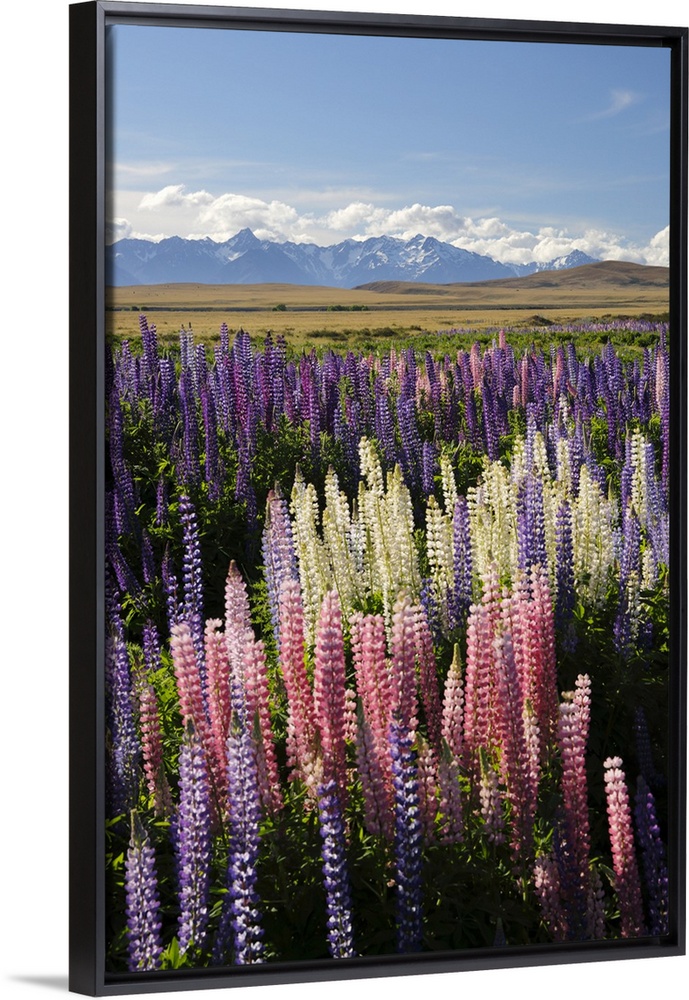 <p>Field of lupins with Southern Alps behind, near Lake Tekapo, Canterbury region, South Island, New Zealand, Pacific</p>