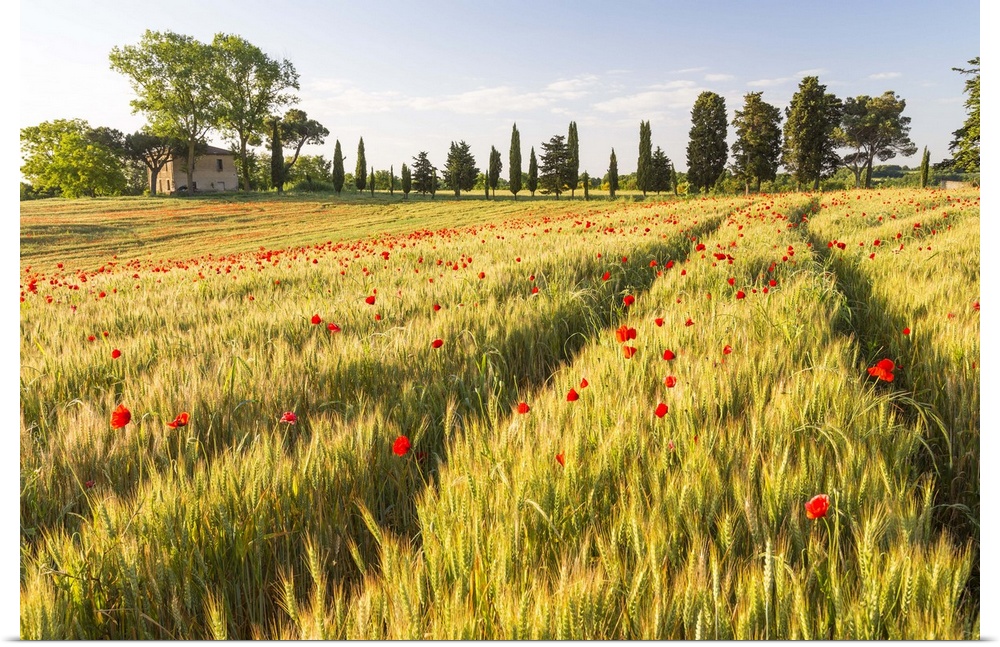 <p>Field of poppies and old abandoned farmhouse, Tuscany, Italy.</p>