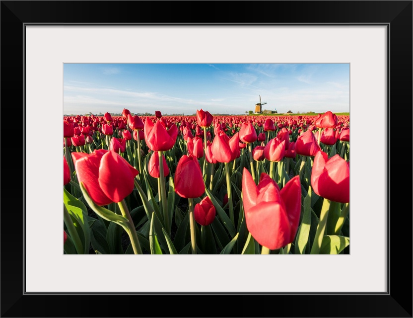 <p>Field Of Red Tulips And Windmill On The Background. Koggenland, North Holland Province, Netherlands.</p>