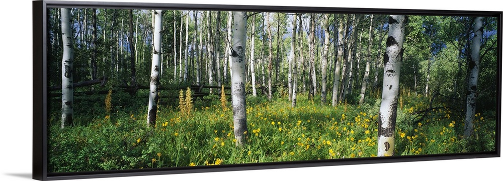 <p>Panoramic photograph of forest with wooden fence running through it and thick lush undergrowth.</p>