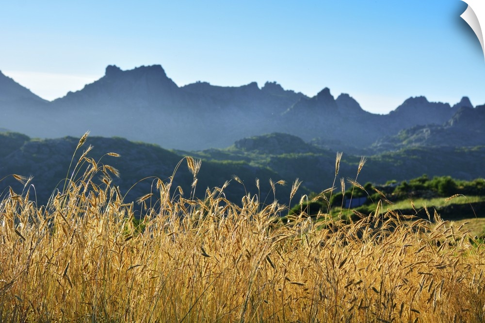 <p>A field of rye at sunset with the mountain range of Pitoes das Junias in the background. Peneda Geres National Park, Portugal.</p>
