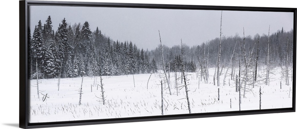 <p>Field of snow in a forest during a winter storm; Mont Saint Saveur, Quebec, Canada</p>
