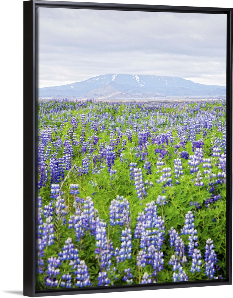 <p>Field with lupine flowers, with a volcano in the background, Iceland.</p>