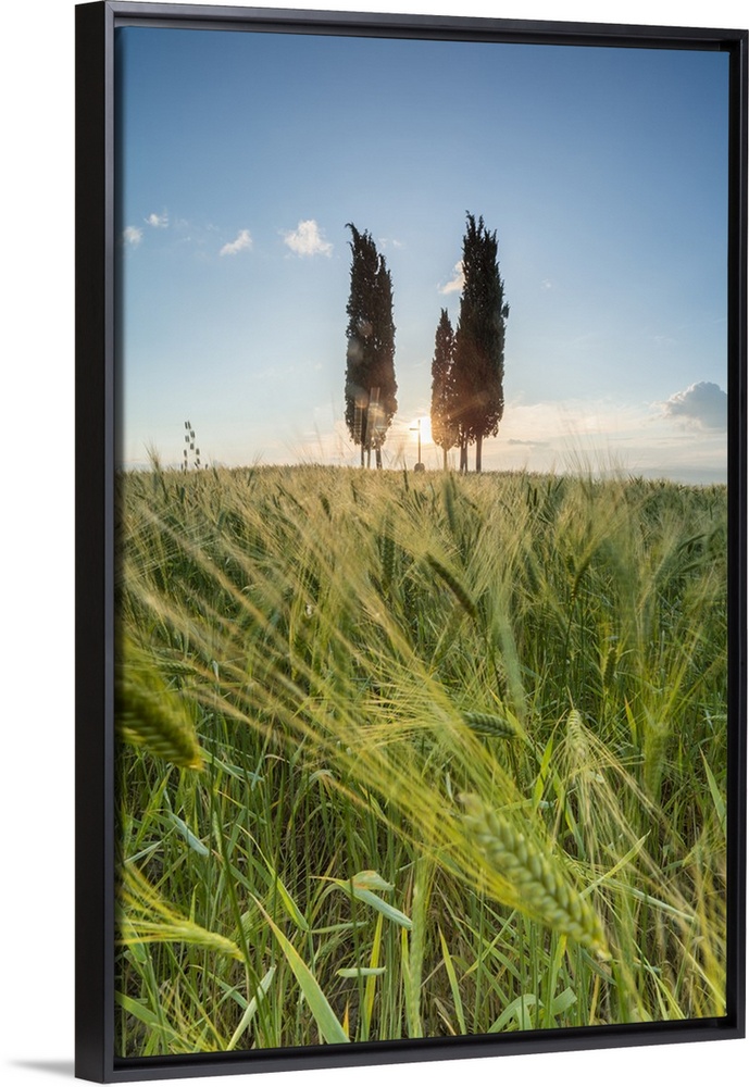 <p>Fields of ears of corn and cypresses on the gentle green hills of Val d'Orcia, Province of Siena, Tuscany, Italy</p>