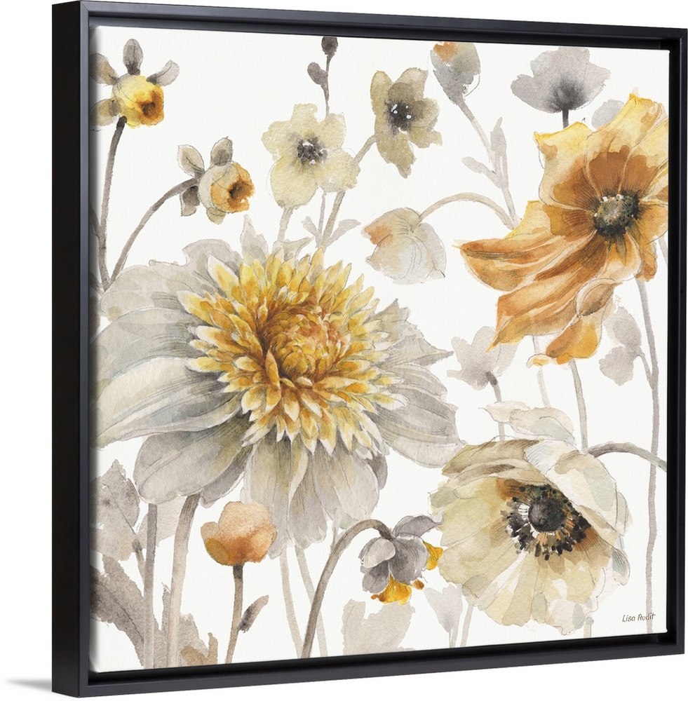 <p>Decorative artwork of group of flowers in muted tones of gold, yellow and gray.</p>