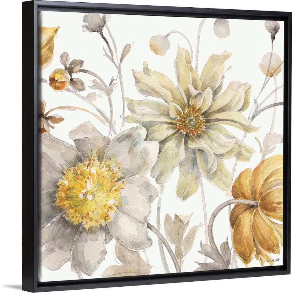 <p>Decorative artwork of group of flowers in muted tones of gold, yellow and gray.</p>