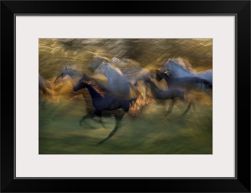 <p>A motion blurred photograph of a herd of wild horses galloping.</p>