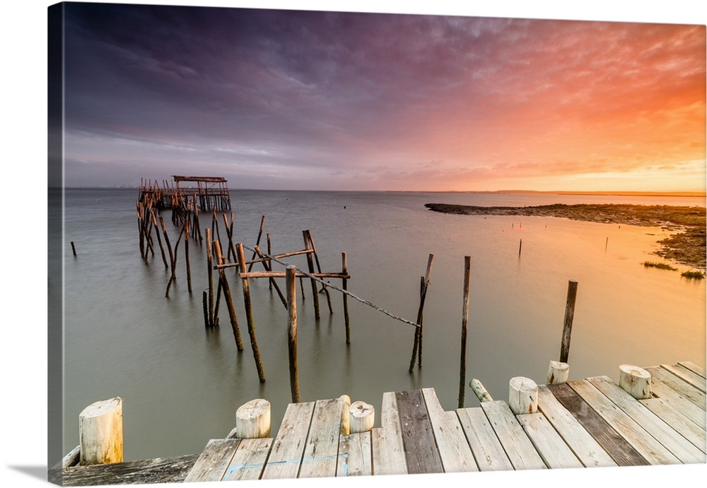 <p>Fiery sky at dawn on the Palafito Pier in the Carrasqueira Natural Reserve of Sado River, Alcacer do Sal, Setubal, Portugal</p>