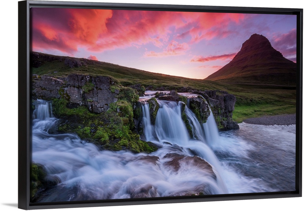 <p>Vivid light on clouds at dusk over a waterfall near Kirkjufell, Iceland.</p>