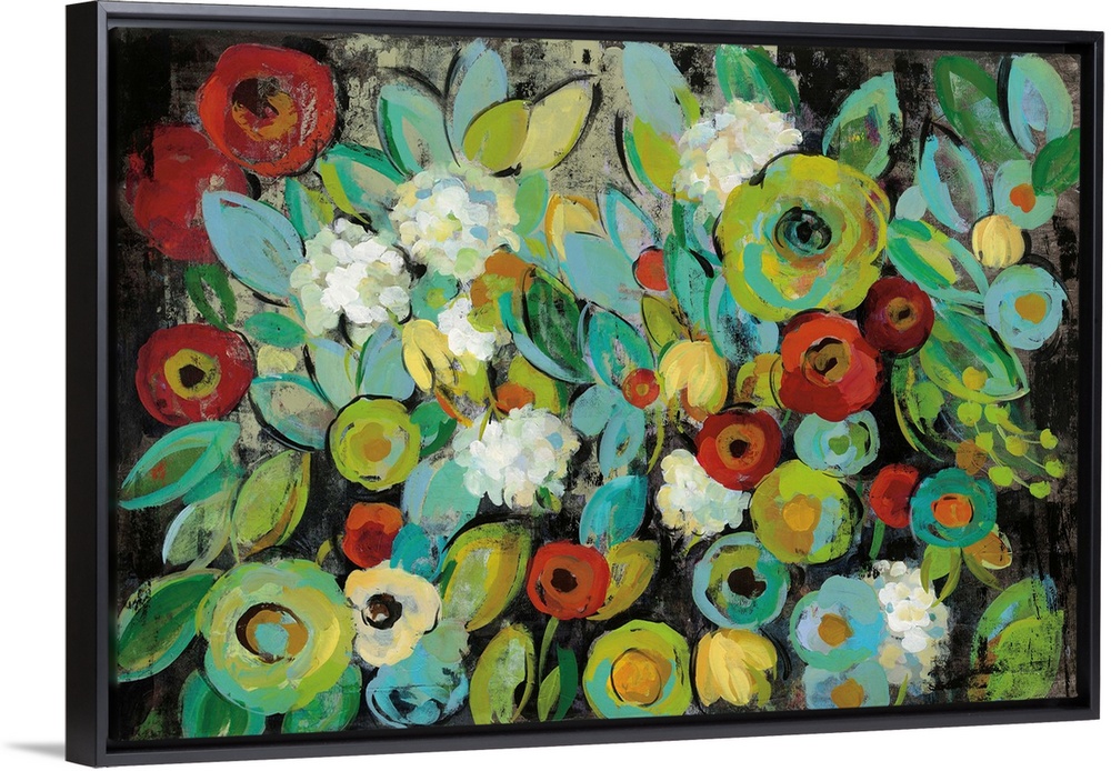<p>Contemporary floral abstract painting with bright colored flowers on a dark black background.</p>