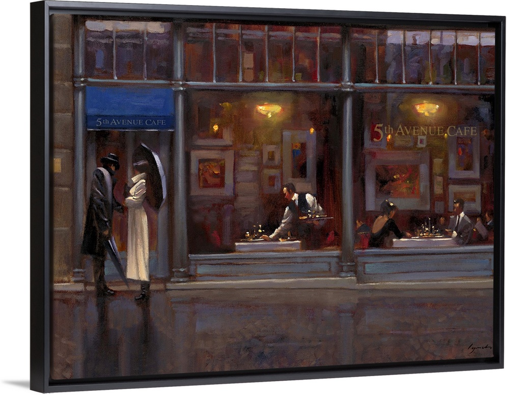 <p>Contemporary painting of a couple standing outside a restaurant door on a rainy evening.</p>