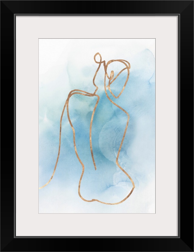 <p>Abstracted nude figure outlined in gold on a blue watercolor background.</p>