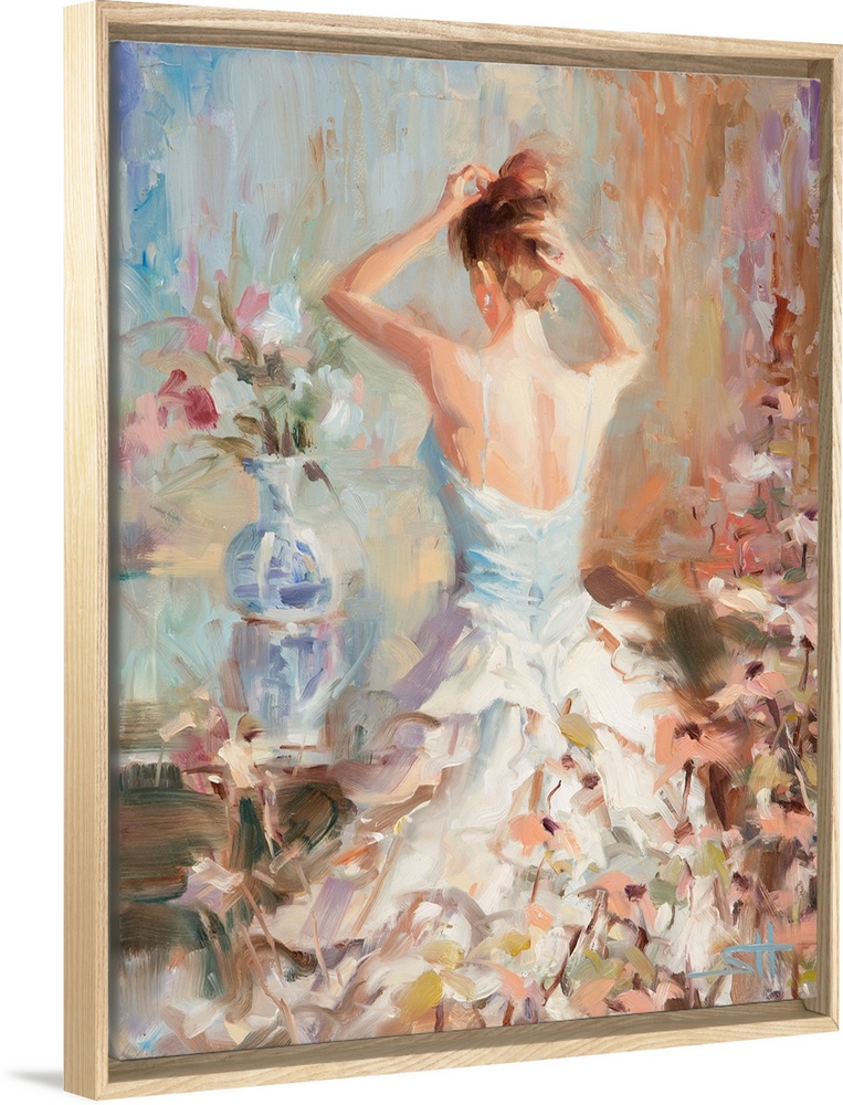 <p>Traditional impressionist painting of an elegant woman in her boudoir or bedroom, fixing her hair and surrounded by vases of flowers.</p>