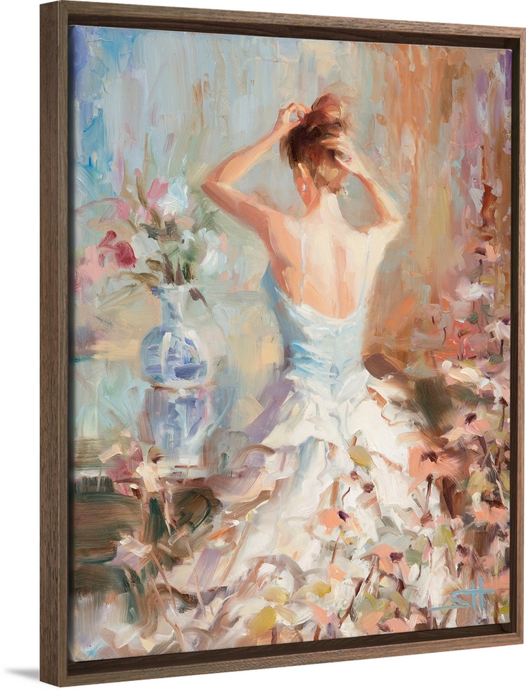 <p>Traditional impressionist painting of an elegant woman in her boudoir or bedroom, fixing her hair and surrounded by vases of flowers.</p>