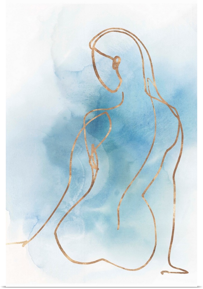 <p>Abstracted nude figure outlined in gold on a blue watercolor background.</p>