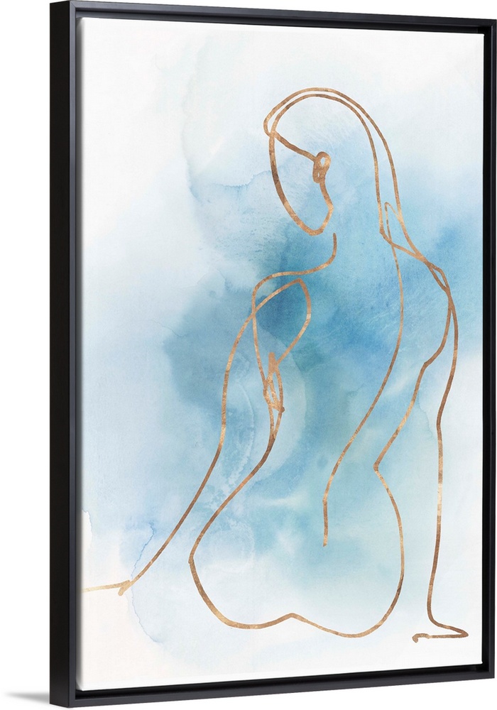 <p>Abstracted nude figure outlined in gold on a blue watercolor background.</p>