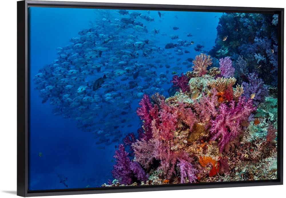 <p>Fiji. Reefscape with coral and black snapper fish.</p>