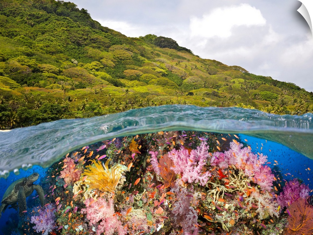 <p>A half above, half below look at a Fijian reef with alconarian and gorgonian coral and a green sea turtle (Chelonia mydas), Fiji.</p>