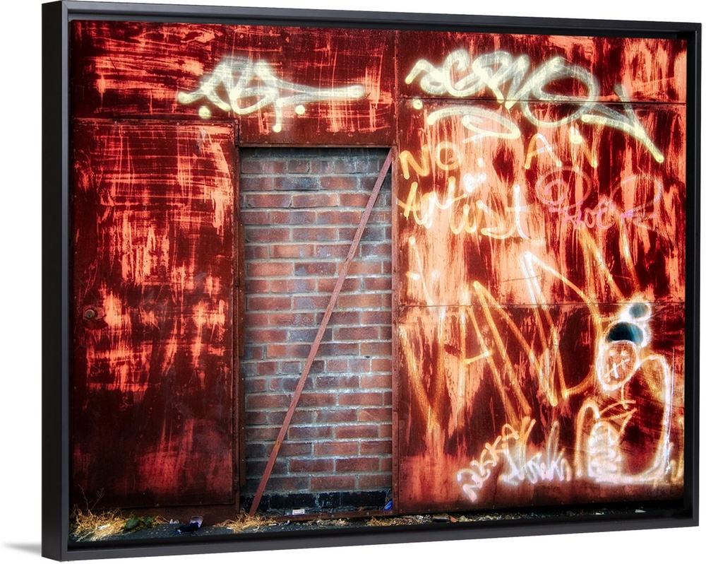 <p>Filled in derelict door with red brickwork and graffiti</p>