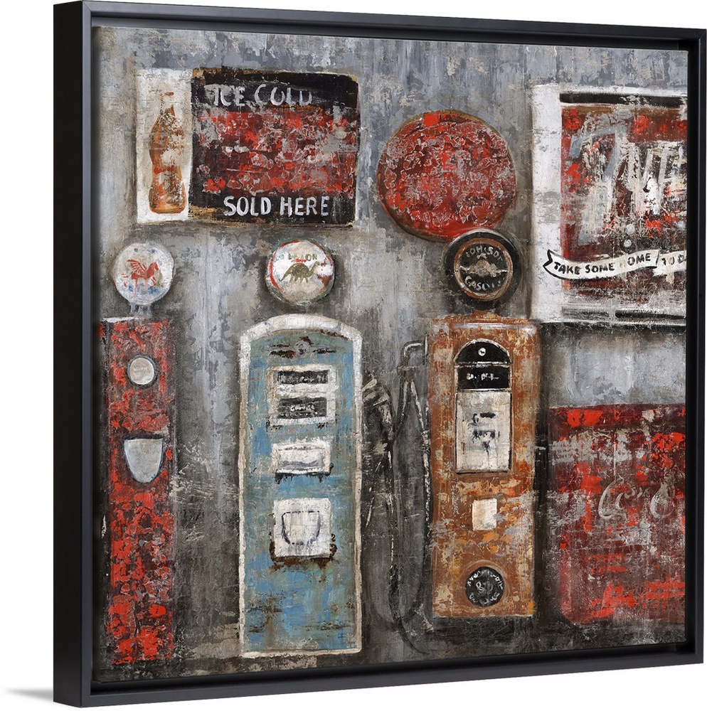 <p>Painting of several vintage gas pumps and signage, painted with a texture that gives an antique feel to the image.</p>