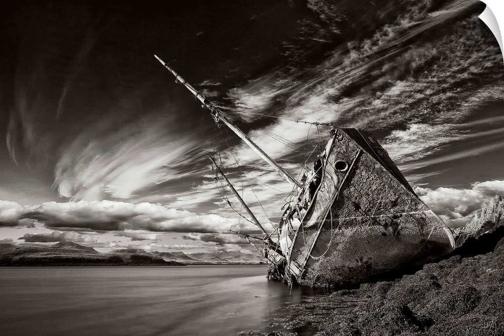 <p>A black and white photograph of a derelict ship washed up on the shores of Iceland.</p>