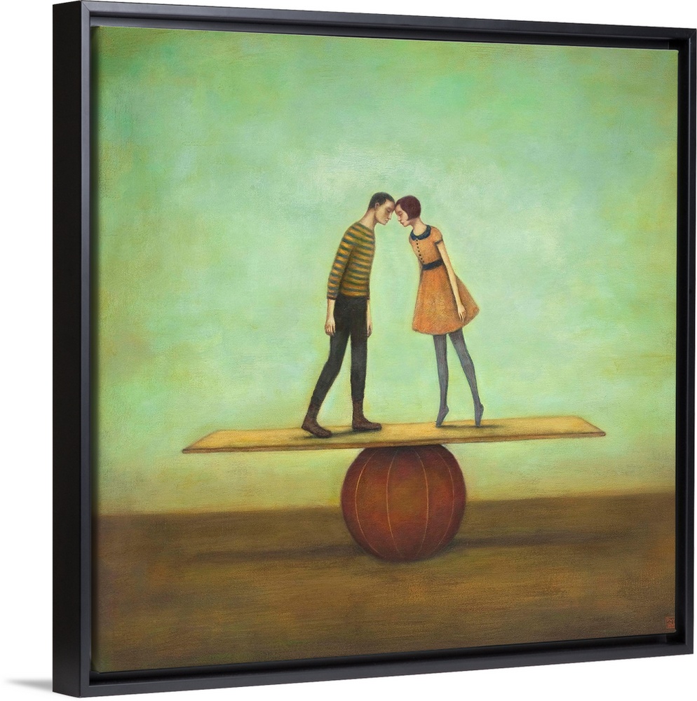 <p>Contemporary surreal artwork of a woman and man kissing on a plank balancing on a red ball.</p>