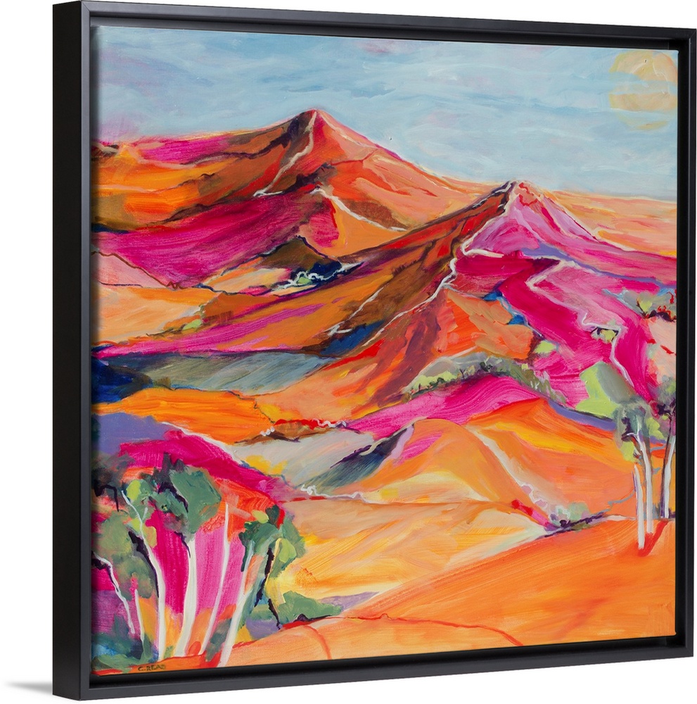 <p>A painting of the outback in bright reds and pinks.</p>