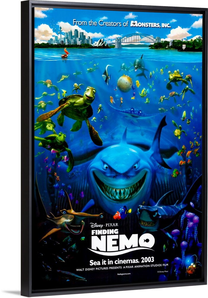 <p>This is a vertical movie poster featuring most of the characters from the beloved computer animated film set underwater and full of marine life characters.</p>