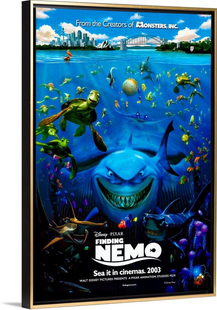 <p>This is a vertical movie poster featuring most of the characters from the beloved computer animated film set underwater and full of marine life characters.</p>