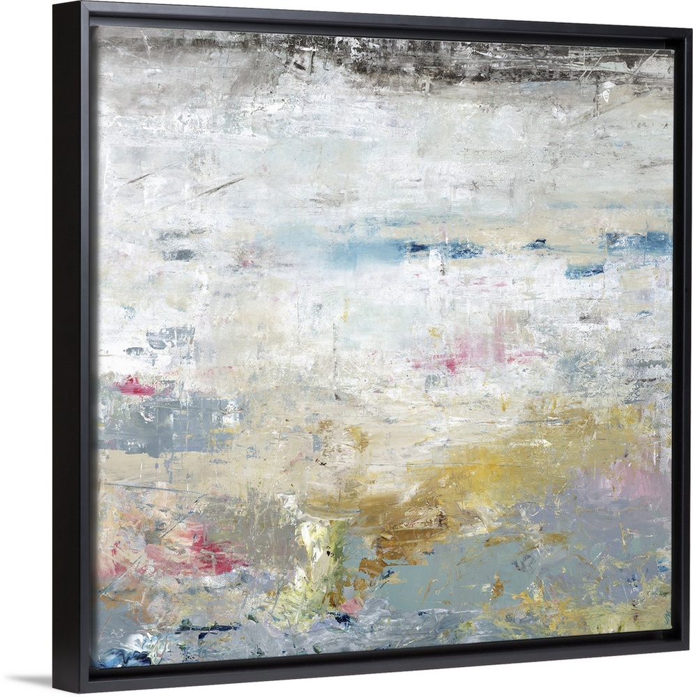 <p>Square abstract painting of textured colors with accents of lighter colors of pink and yellow.</p>