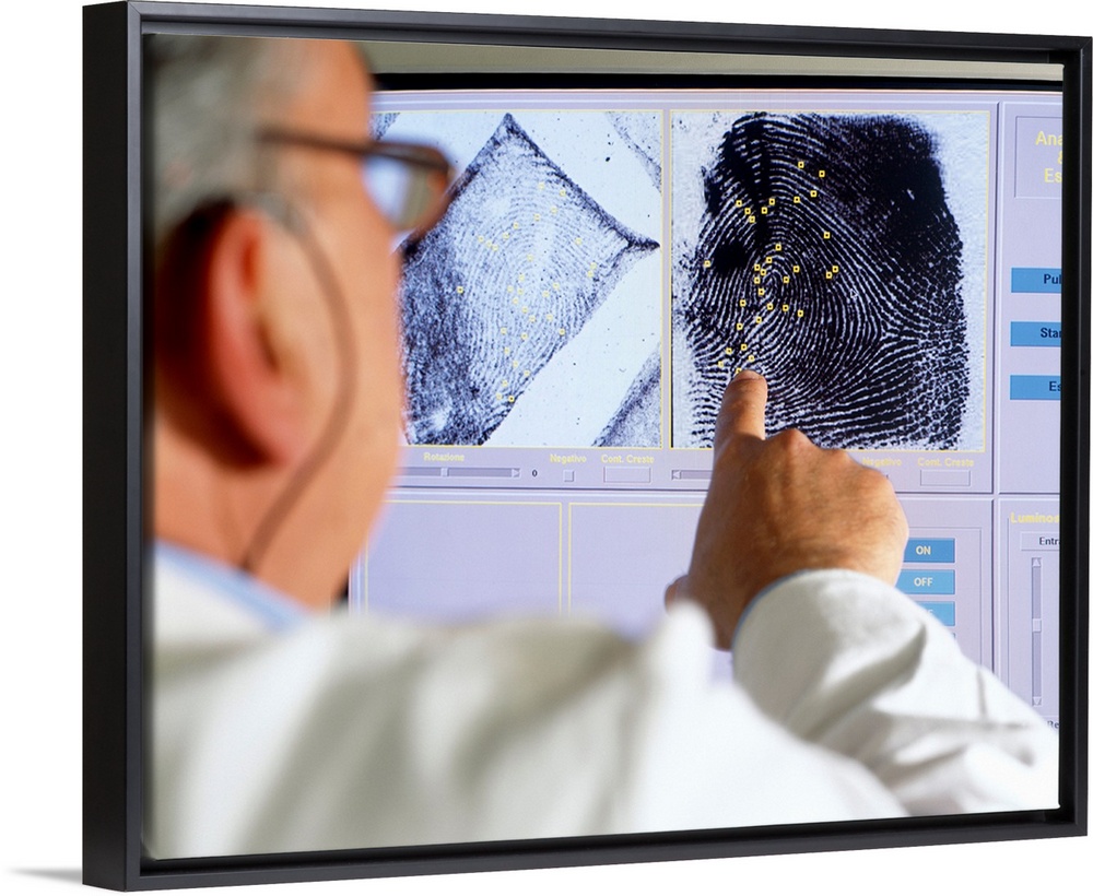 <p>Fingerprint analysis. Forensic scientist pointing at fingerprints being compared by characteristic features (square yellow markers). Fingerprints are classified into three basic types and are then further classified by features which are called minutia points or ridge characteristics. There are around thirty different types of these. The ridge characteristics are considered unique for each individual. As few as seven ridge characteristics in the same position are needed for a positive identification. Computer analysis has enabled very large numbers of fingerprints to be compared with great speed, allowing suspects to be linked to any unsolved crime on record.</p>