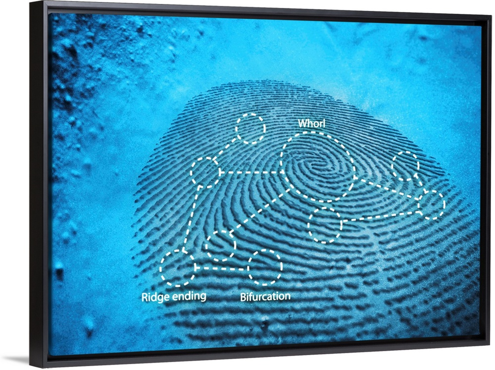 <p>Fingerprint. Computer artwork of a fingerprint residue showing typical patterns for feature identification (whorl, ridge ending and bifurcation). A fingerprint is a water and oil pattern imprinted by the ridges on the skin of the finger. These ridges form a distinct pattern, with each fingerprint being unique to an individual. Even identical twins have different fingerprints. They are therefore useful as a physiological biometric characteristic, where biometrics is the identification of people by their body parts.</p>
