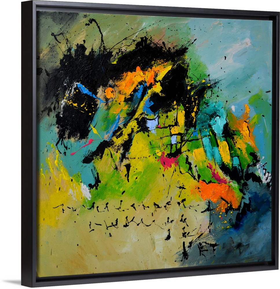 <p>A square abstract painting in muted shades of green, blue, orange and yellow with splatters of paint overlapping.</p>