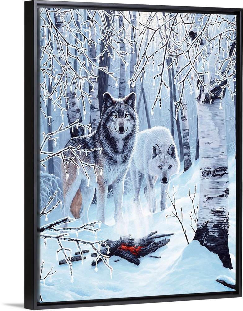 <p>Two wolves stand under a group of birch trees, next to a campfire, on a snow covered ground.</p>
