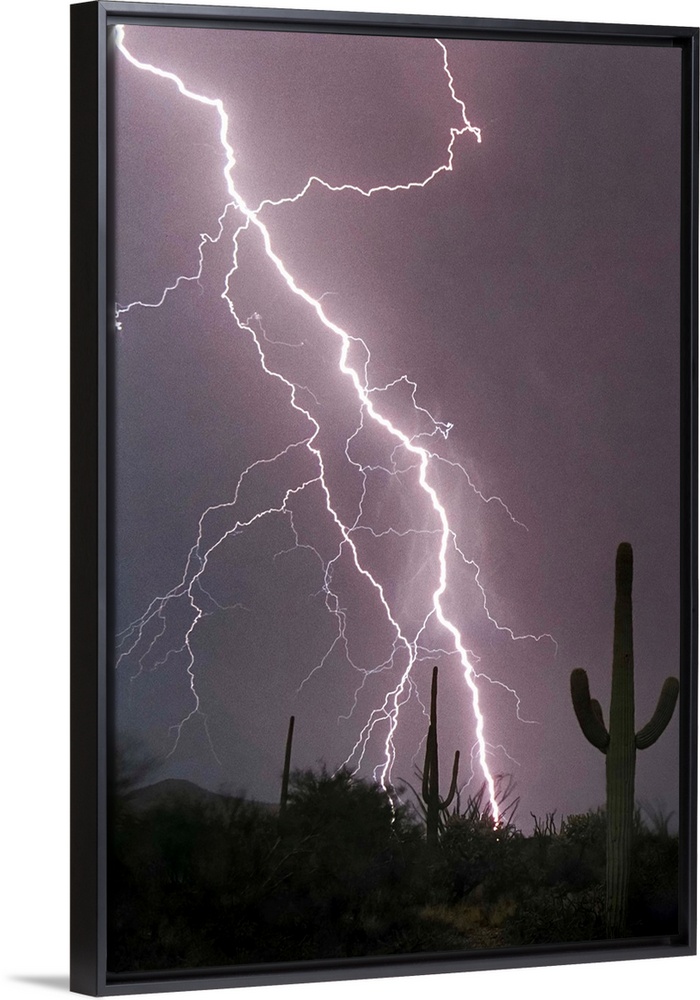 <p>Photograph of lightning striking in a purple sky above a desert with cacti.</p>